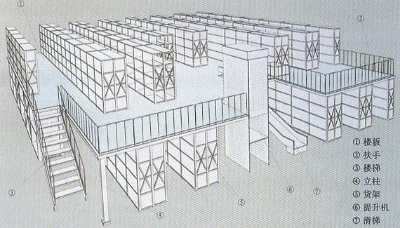 阁楼式货架面板有平板、花纹钢板、冲孔钢板等品种以适应防火、通风、光照等等不同使用要求。货物上下楼层可选择叉车、液压升降台、货梯等方式;货物同层运输通常使用小型手推车完成。