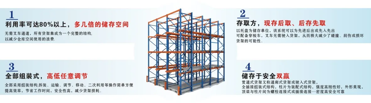 仓储式货架、贯通式货架,都是采用格构式立柱边续方式连接起来的多门式、托盘单元化货品沿深度方向一个紧接一个存储在悬臂梁上的货架结构形式。这种模具架结构形式可使叉车作业通道和货品存储空间共用,大大提高了仓库的空间、场地面积利用率,但同一作业通道内的货品不能做到先进先出,适合于大批量、少品种或作业通道内的货品一起流向同一客户的货品存储,如饮料、乳制品、烟草、低温冷冻仓储、标准规格的家电、化工、制衣等行业。据统计,驶入式货架可以达到最大的存储密度。