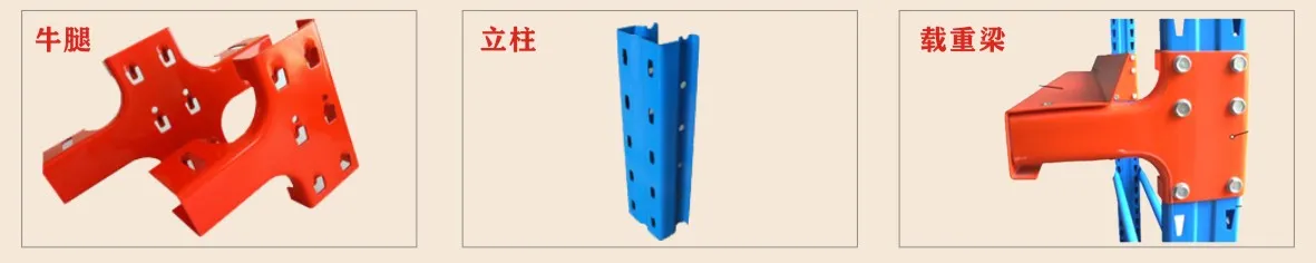 贯通式货架由于储存的货物比较密集,稳固性要求极高,因此所需要的货架配件相对较多,通过配件与货架立柱片的连接,令货物能安全密集地存放在牛腿梁上,最大程度地利用空间。驶入式货架的配件包括:牛腿(牛腿梁与货架立柱的主要连接件,分单面与双面)、牛腿梁(货物存放的主要支承搁层)、顶梁(货架立柱的连接稳固件)、顶拉(货架立柱的连接稳固件)、背拉(货架立柱的连接稳固件,用于货架单向排布时)、护脚(货架正面保护件)、护轨(叉车进入巷道时货架保护件)等。