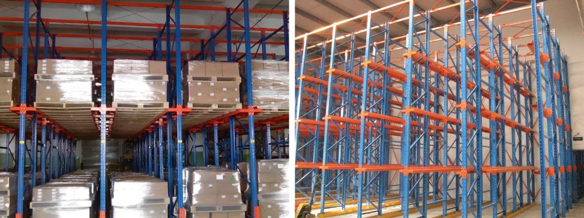 仓储式货架、贯通式货架,都是采用格构式立柱边续方式连接起来的多门式、托盘单元化货品沿深度方向一个紧接一个存储在悬臂梁上的货架结构形式。这种模具架结构形式可使叉车作业通道和货品存储空间共用,大大提高了仓库的空间、场地面积利用率,但同一作业通道内的货品不能做到先进先出,适合于大批量、少品种或作业通道内的货品一起流向同一客户的货品存储,如饮料、乳制品、烟草、低温冷冻仓储、标准规格的家电、化工、制衣等行业。据统计,驶入式货架可以达到最大的存储密度。